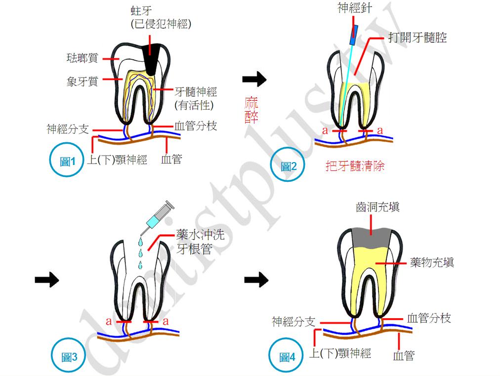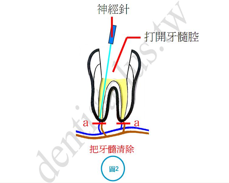 因為牙髓神經還是活性的,所以需要先麻醉,清除蛀牙,打開牙髓腔,把牙根內神經血管徹底清除,直清除到〝a〞點。