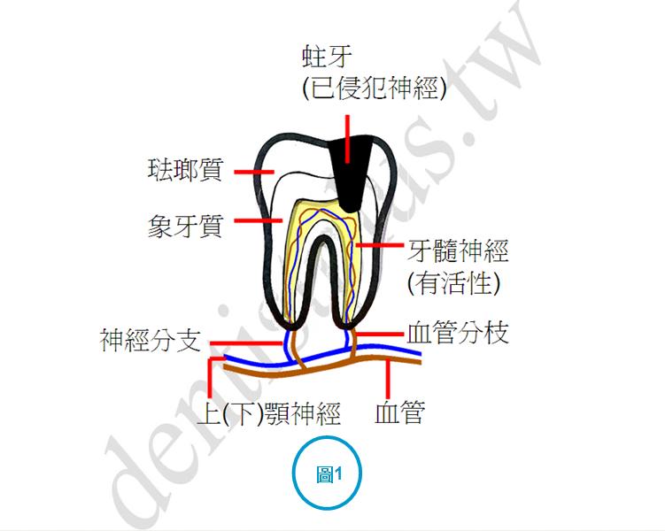 蛀牙明顯侵犯到神經,或者因蛀牙範圍過大,準備作瓷牙冠保護起來,此時就需要作根管(抽神經)治療。(圖1)
