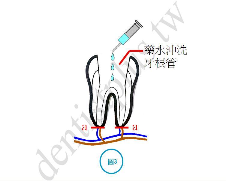 清除完牙髓神經後,會在下次回診沖洗根管,確認根管完全乾淨,並解查a點的傷口是否復原(圖3)