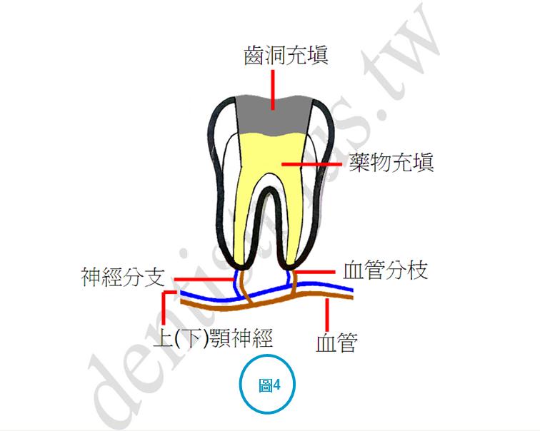 有時牙髓急性發炎,產生劇痛,此時先不作圖2的治療,會先給3天藥,讓急性發炎緩解,才著手進行根管治療。